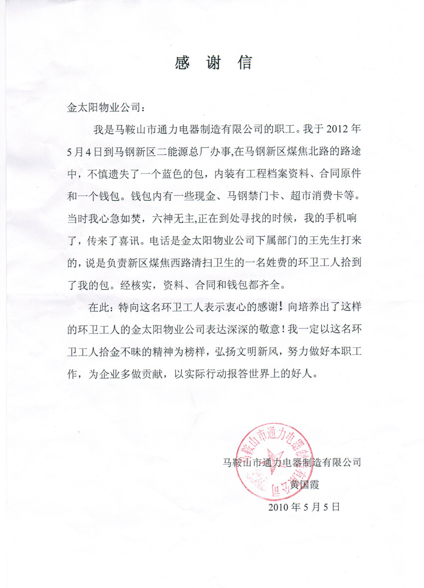 金太阳物业公司环卫工人拾金不昧,失主特发来感谢信!